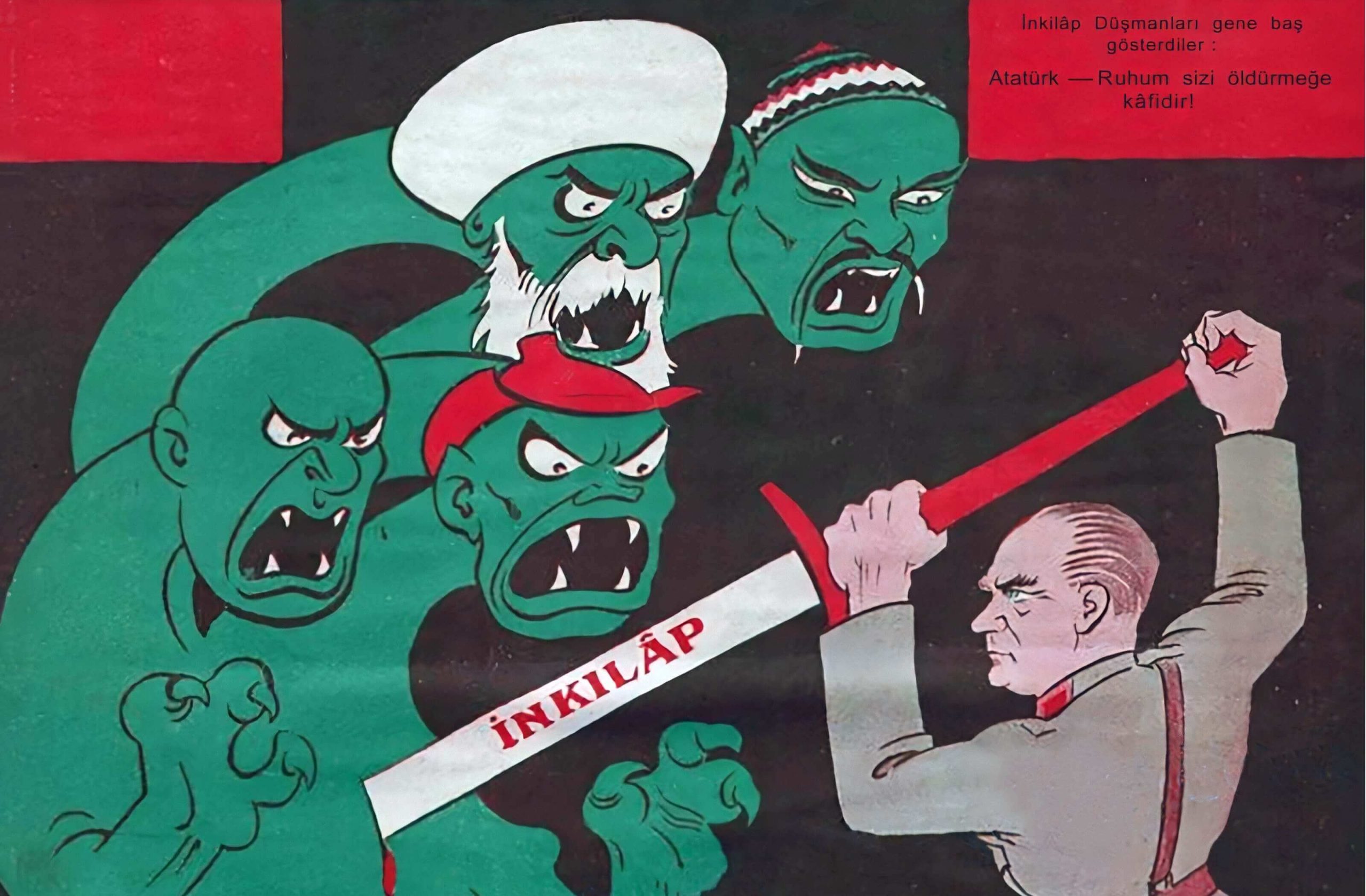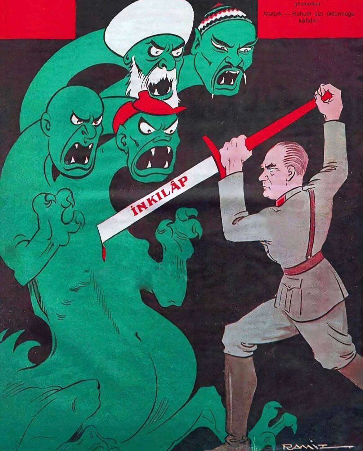 Atatürk’ün “inkılâp kılıcı”nı sapladığı yeşil canavarın sarıklı, saçsız, kızıl şapkalı ve çekik gözlü başları sırasıyla “İslamcı”, “faşist”, “komünist” ve “turancı / ırkçı” gericileri temsil ediyor.