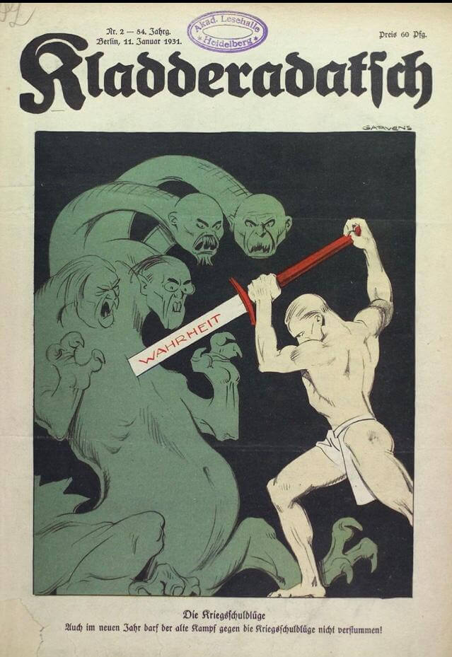 İLAVE: Ramiz Gökçe’nin Atatürk’ün “Ruhum sizi öldürmeye kafidir” sözüyle “İnkilap Düşmanları”na kılıcını sapladığı çizimi Alman dergisi Kladderadatsch dergisinin 1931 yılındaki kapak görseli üzerine inşa edilmiş. Adı geçen dergide “gerçek” (“wahrheit”) yazılı kılıcını Lloyd George, Wilson, Clemenceau ve Poincaré’in suretlerini barındıran “savaş suçu yalanı”nı temsil eden 4 başlı yaratığa saplayan bir Alman resmedilmiş (Tespit: Propagandopolis).