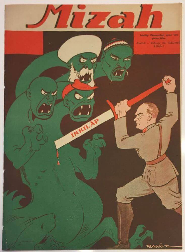 Ramiz Gökçe’nin Mizah Dergisi’nde 13 Haziran 1947 günü yayımlanan karikatüründe Atatürk’ün “inkılâp kılıcı”nı sapladığı canavarın sarıklı, saçsız, kızıl şapkalı ve çekik gözlü başları sırasıyla “İslamcı”, “faşist”, “komünist” ve “turancı/ırkçı” gericileri temsil ediyor.