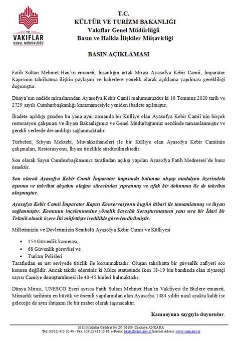 Kültür ve Turizm Bakanlığı Vakıflar Genel Müdürlüğü’nce Ayasofya Camii’nin imparator kapısındaki aşınma ve tahribatın, ahşabın olağan sürecinden yıpranması ve ufak dokunma sonucu oluştuğu belirtilerek, “Ayasofya Kebir Camii İmparator Kapısı konservasyonu bugün itibarı ile tamamlanmış ve ihyası sağlanmıştır” açıklaması yapılmıştı.