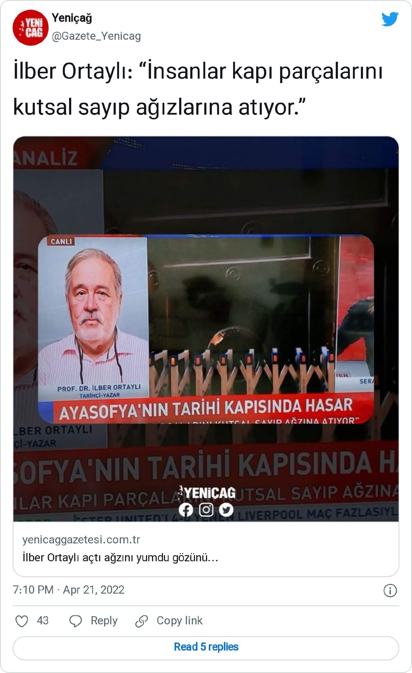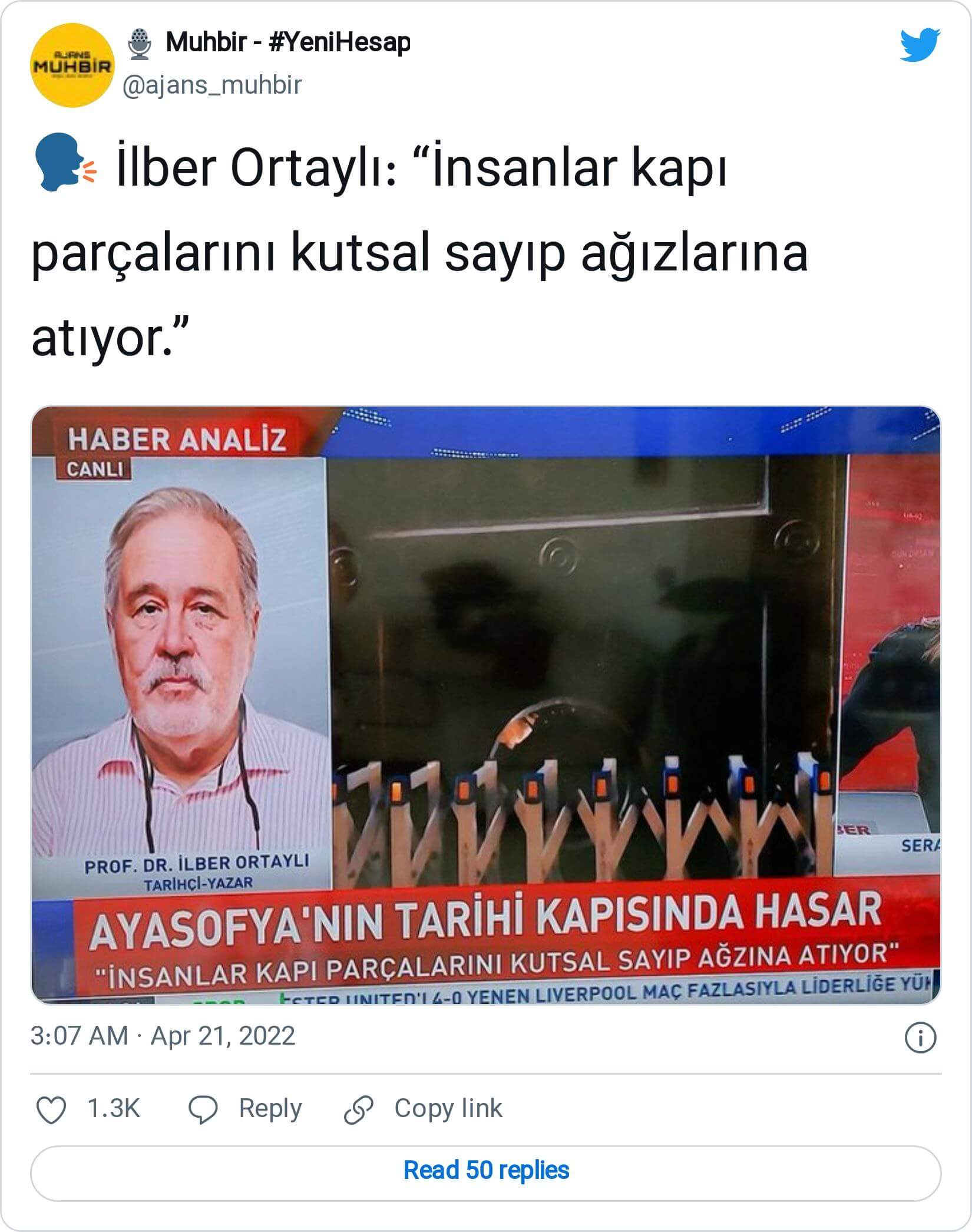 Halbuki, Ayasofya Camii’nde gözlemlenen tahribata dair İlber Ortaylı’nın “insanlar kapı parçalarını kutsal sayıp ağızlarına atıyor” ifadelerini kullandığı iddiası doğru değil. Bahse konu cümle, Ayasofya’nın imparatorluk kapısında oluşan hasar akabinde gazetecilere röportaj veren Sanat Tarihi Derneği Yönetim Kurulu Başkanı Şerif Yaşar’a ait. Ortaylı, katıldığı yayında Ayasofya’nın kapısındaki hasara dair “kesinlikle bir şebeke işi” yorumunda bulunmuştu. Sunucu Serap Belet’in Ayasofya kapısını insanların kutsal addetmeleri nedeniyle kemirmiş olabileceği iddiasını dile getirmesi akabinde Ortaylı, bu iddianın gerçek dışı olduğunu belirtmişti.