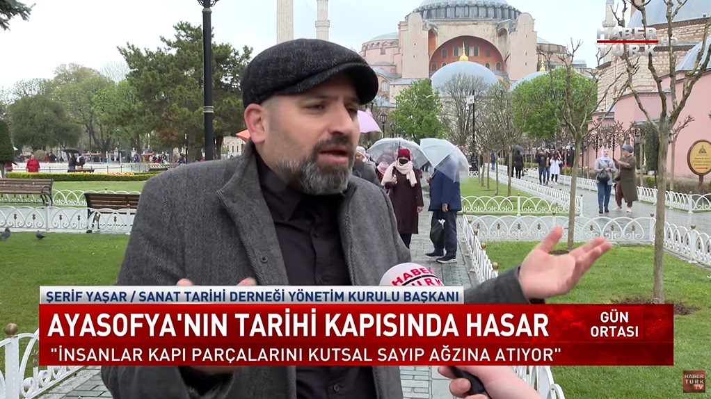 Habertürk’teki Ayasofya’nın tarihî kapısındaki hasarla ilgili yayındaki KJ’de de Şerif Yaşar’ın bu sözüne yer verildiği görülebiliyor.