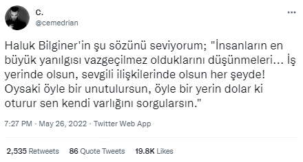 “Haluk Bilginer’in şu sözünü seviyorum” vurgusuyla bu hatalı aktarım ((Hastanede “karın öldü” denilen Tolstoy’un tepkisi uydurmasını hâlâ paylaşmakta ısrar eden parodi profil) Cemedrian ve sıklıkla yanlış vecize aktarımları paylaşan Müthiş Psikoloji üzerinden) şu şekilde örneklenebilir: