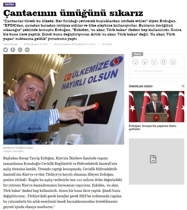 Cumhurbaşkanı Erdoğan, Rize’nin İkizdere ilçesinde yapımı tamamlanan Konukoğlu Cevizlik Regülatörü ve Hidroelektrik Santrali’nin 11 Ağustos 2010 tarihinde gerçekleştirilen açılış törenine katılarak fotoğraftaki panelde görülen kırmızı düğmeye basarak santralin açılışını yapmıştı.