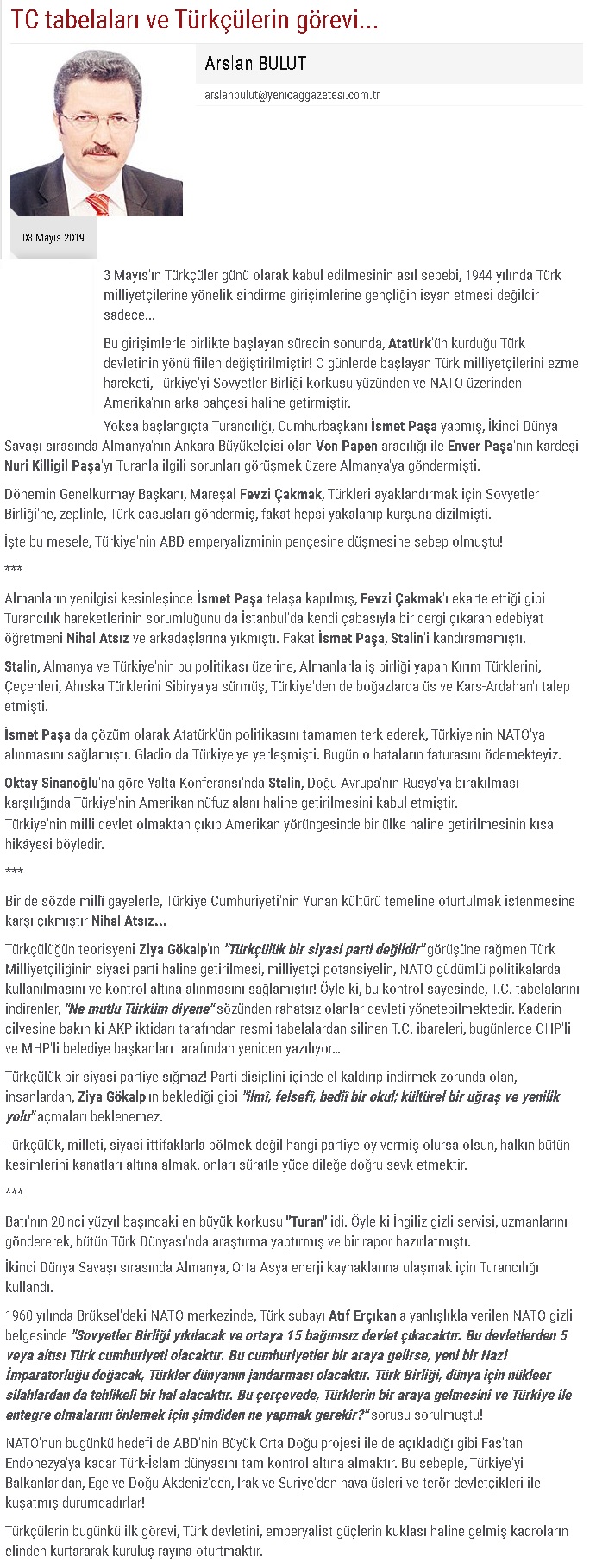 Konya Hakimiyet Gazetesi yazarı Dursun Seyis, “Nereden, Nereye” başlıklı 6 Mayıs 2019 tarihli yazısında Arslan Bulut’un Yeniçağ Gazetesinde 3 Mayıs 2019 tarihinde yayınlanan “TC Tablelaları ve Türkçülerin Görevi” başlıklı köşe yazısının büyük bölümünü herhangi bir kaynak atfı yapmadan kullanmış.