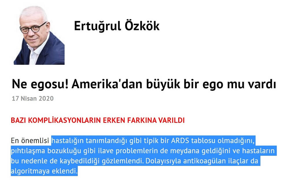 Hürriyet Gazetesi yazarı Ertuğrul Özkök, “Ne egosu! Amerika’dan büyük bir ego mu vardı” başlıklı 17 Nisan 2020 tarihli yazısında Medipol Üniversitesi Üroloji Bölümü’nden Prof. Dr. Zeki Bayraktar’ın analizini -kendisine herhangi bir referans vermeksizin- aynen kullanmış.