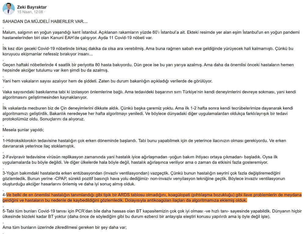 Prof. Dr. Zeki Bayraktar’ın Facebook profilinde Özkök’ün yazısından 2 gün önce 15 Nisan 2020 tarihinde paylaştığı “Sahadan da Müjdeli Haberler Var” başlıklı yazısından ilgili bölüm ise şöyleydi: