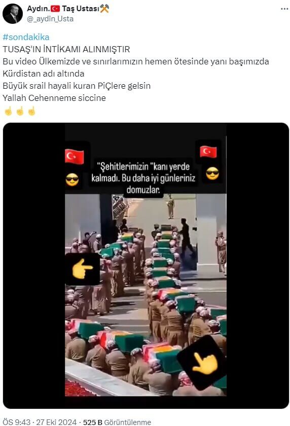 Aydın Taş Ustası (@_aydin_Usta): “#sondakika TUSAŞ’IN İNTİKAMI ALINMIŞTIR Bu video Ülkemizde ve sınırlarımızın hemen ötesinde yanı başımızda Kürdistan adı altında Büyük srail hayali kuran PiÇlere gelsin Yallah Cehenneme siccine”