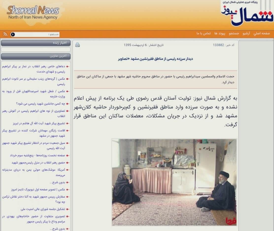Bahsi geçen ziyarette Reisi, Meşhed’in kenar mahallelerindeki yoksul ve imtiyazsız bölgelere girerek bu bölgelerde yaşayanların sorunları hakkında bilgi almış.