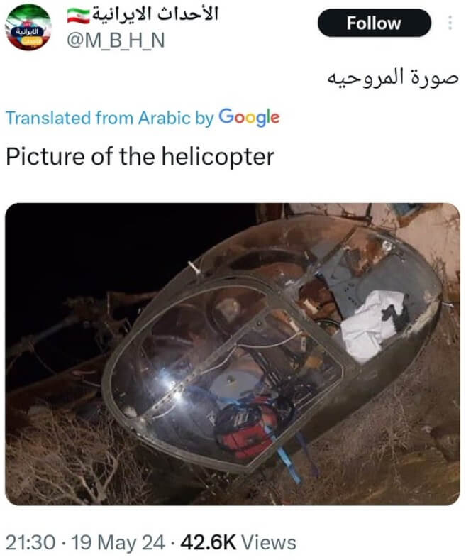 Bu süreçte, İran Cumhurbaşkanı İbrahim Reisi ve Dışişleri Bakanı Hüseyin Amir Abdullahyan ile beraberlerindeki heyeti taşırken 19 Mayıs 2024 günü düşen helikopterin enkazına ait olduğu iddiasıyla birçok ilintisiz görüntü sosyal medyada ve haber sitelerinde dolaşıma girdi.