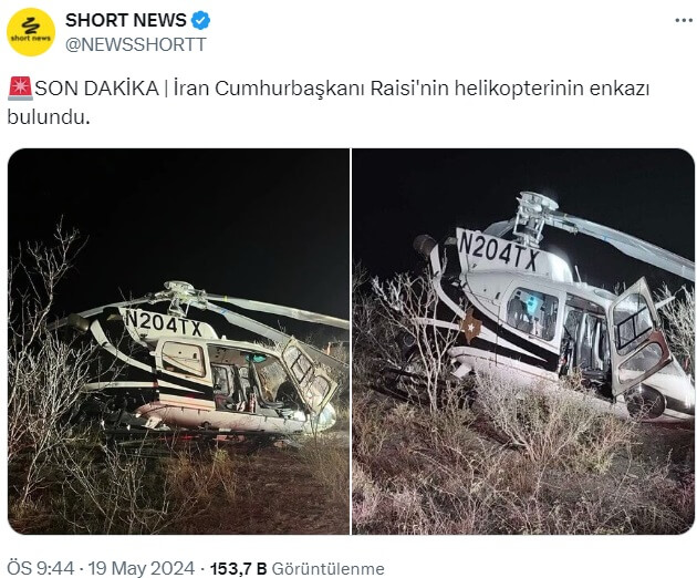 Short News (@newsshortt): “SON DAKİKA | İran Cumhurbaşkanı Raisi’nin helikopterinin enkazı bulundu.”
