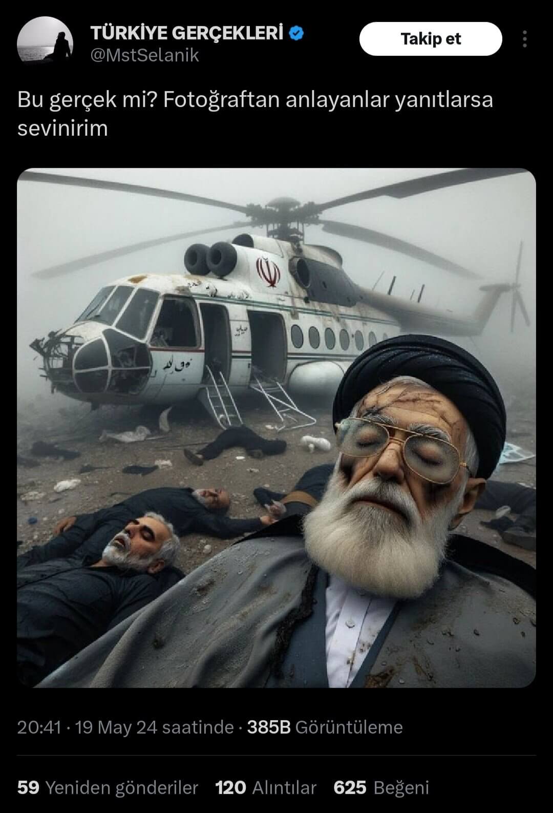 İran Cumhurbaşkanı Reisi’nin helikopter kazasının ardından yapay zeka uygulamasıyla hazırlanan görsel “Bu gerçek mi?” sorusuyla paylaşıldı.