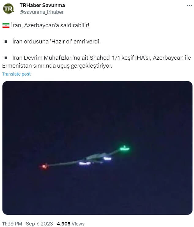 “Iran Shahed-171 İHA’lar Zangezur üzerinde görülmüş. İran müdaheleyi bekliyor belli ki #iran #azerbaycan #karabakh #armenia”