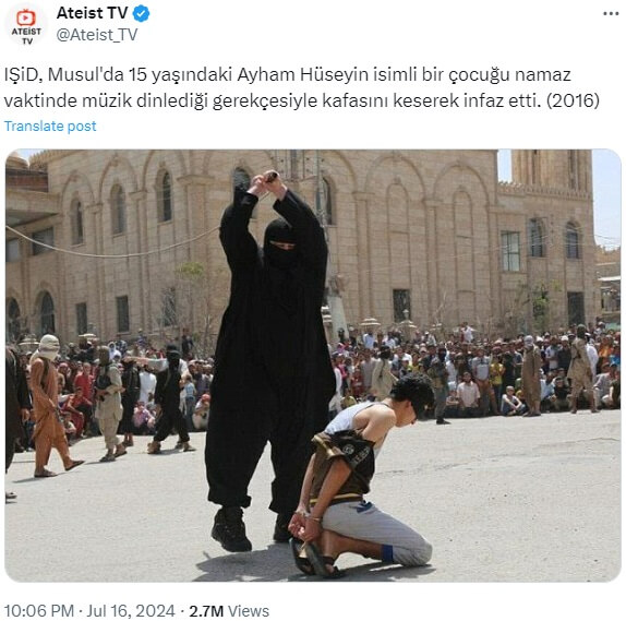 Ateist TV (@Ateist_TV): “IŞiD, Musul’da 15 yaşındaki Ayham Hüseyin isimli bir çocuğu namaz vaktinde müzik dinlediği gerekçesiyle kafasını keserek infaz etti. (2016)”