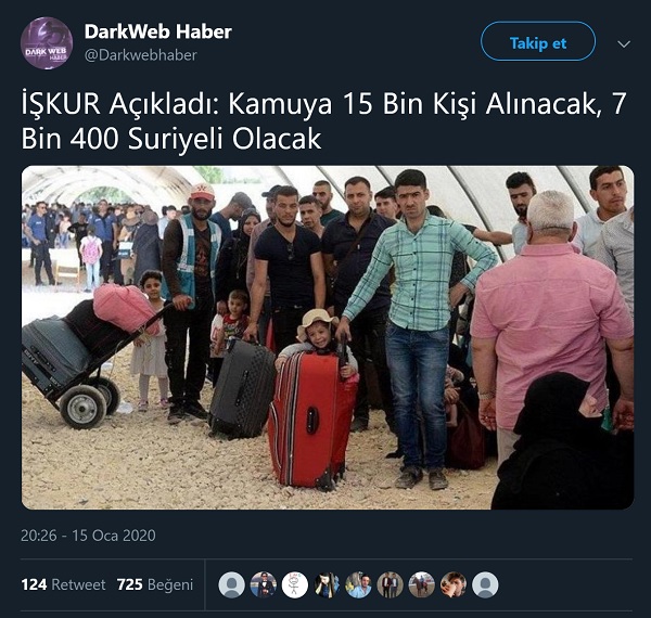Darkweb Haber’in “İŞKUR Açıkladı: Kamuya 15 Bin Kişi Alınacak, 7 Bin 400 Suriyeli Olacak” şeklinde yaptığı paylaşım
