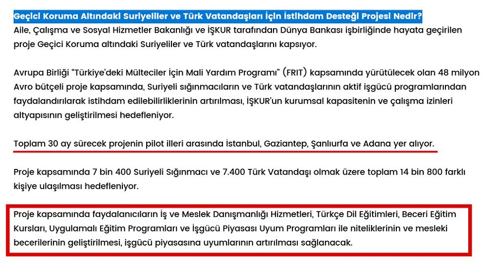 İŞKUR’un internet sitesindeki Geçici Koruma Altındaki Suriyeliler ve Türk Vatandaşları İçin İstihdam Desteği Projesi hakkındaki sayfadan ilgili bölüm