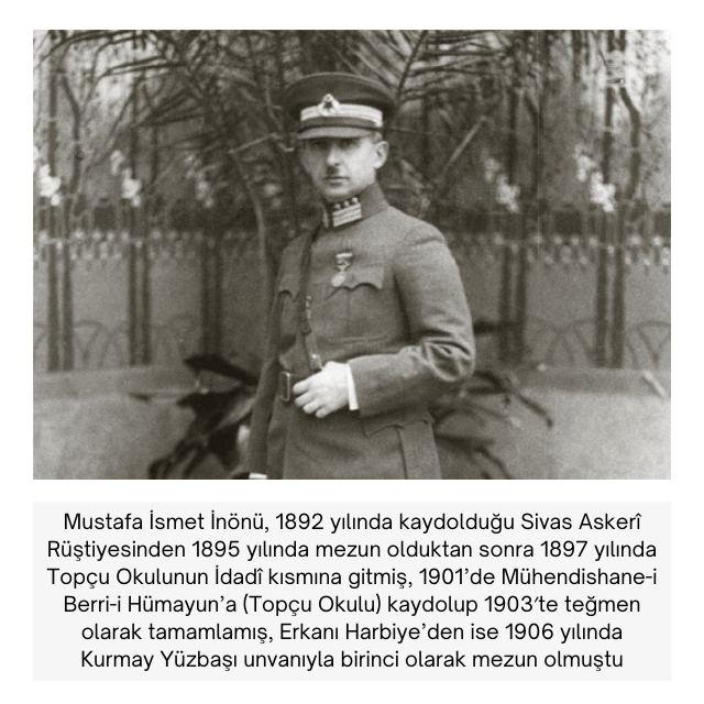 Mustafa İsmet İnönü, 1892 yılında kaydolduğu Sivas Askerî Rüştiyesinden 1895 yılında mezun olduktan sonra 1897 yılında Topçu Okulunun İdadî kısmına gitmiş, 1901’de Mühendishane-i Berri-i Hümayun’a (Topçu Okulu) kaydolup 1903′te teğmen olarak tamamlamış, Erkanı Harbiye’den ise 1906 yılında Kurmay Yüzbaşı unvanıyla birinci olarak mezun  olmuştu.