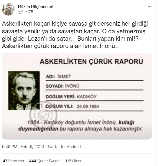 “İsmet İnönü’nün ezanı yasakladığını herkes bilir ama çürük raporuyla askere gitmediğini kimse bilmez. Hadi buna da yalan deyin CEHAPELİLER?”