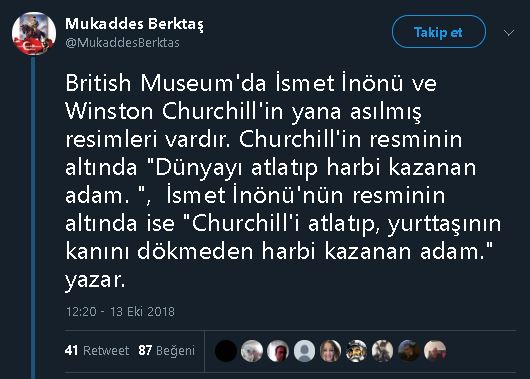 İsmet İnönü’nün resminin altında ise “Churchill’i atlatıp, yurttaşının kanını dökmeden harbi kazanan adam.” yazar.”