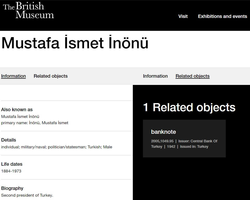 British Museum internet sitesinde İsmet İnönü’nün isminin Winston Churchill ile ilgili başlıklarla ilişkilendirildiği görülebiliyor.