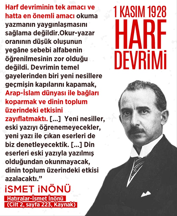 “Harf devriminin tek amacı ve hattâ en önemli amacı okuma yazmanın yaygınlaşmasını sağlama değildir. Devrimin temel gayelerinden biri yeni nesillere geçmişin kapılarını kapamak, Arap-İslâm dünyası ile bağları koparmak ve dinin toplum üzerindeki etkisini zayıflatmaktı. Yeni nesiller eski yazıyı öğrenemeyecekler, yeni yazı ile çıkan eserleri de biz denetleyecektik. Din eserleri eski yazıyla yazılmış olduğundan okunmayacak, dinin toplum üzerindeki etkisi azalacaktı (Kaynak: İ. İnönü. Hatıralar C. 2, s. 223)”