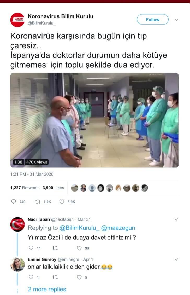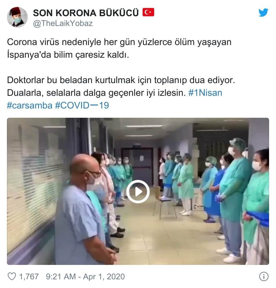 “Koronavirüs karşısında bugün için tıp çaresiz.. İspanya’da doktorlar durumun daha kötüye gitmemesi için toplu şekilde dua ediyor.” notuyla yapılan paylaşımlardan bazıları şöyle: