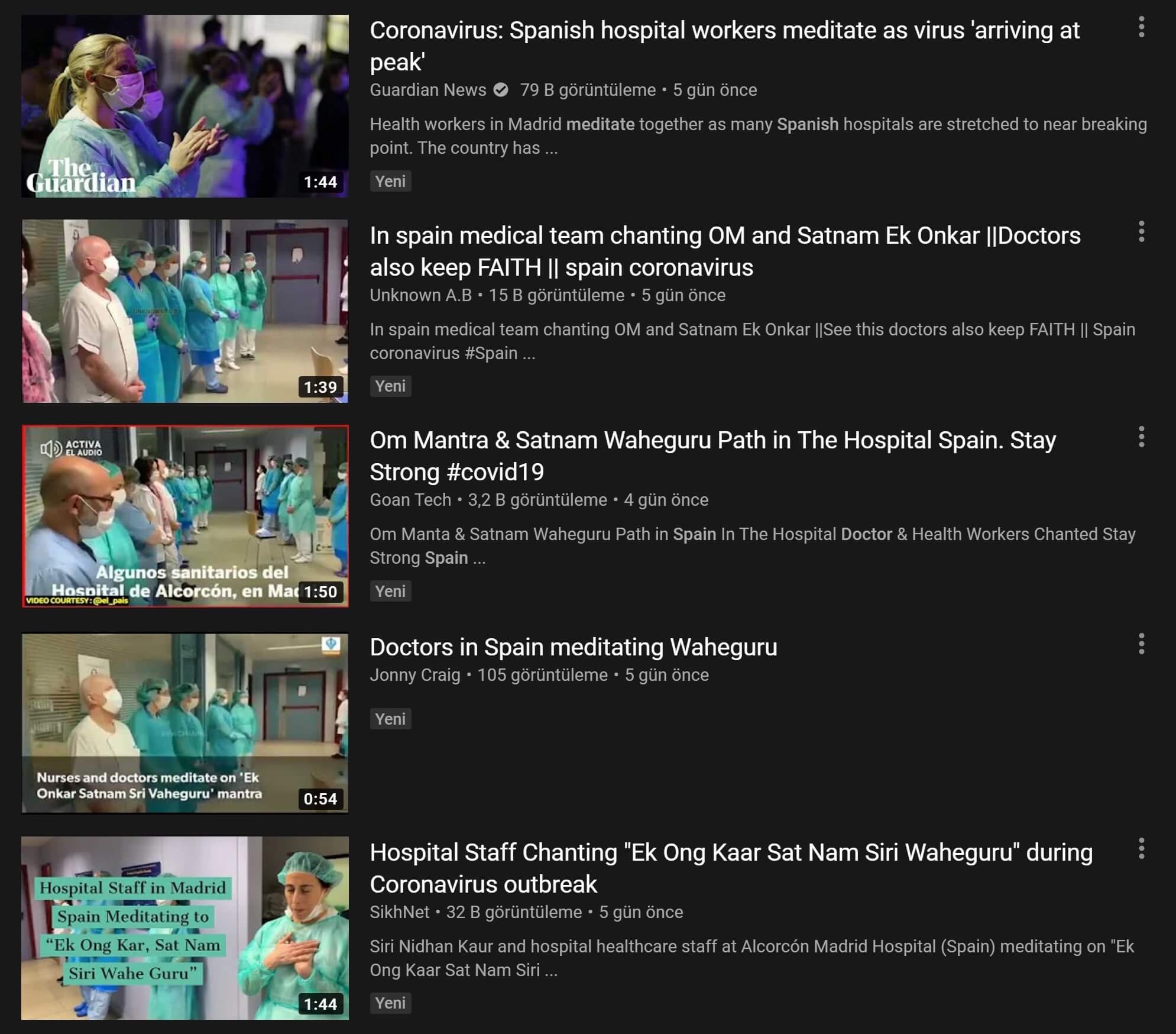 “İspanya’da bilim çaresiz kaldığı için doktorlar toplu dua etmeye başladı” iddiasıyla sosyal medyada paylaşılan videodaki sağlık görevlileri, Gurudass’ın “Ek Ong Kar” adlı meditasyon melodisi eşliğinde “Ek Ong Kar” ya da diğer ismiyle “Adi Shakti Mantrası”nı söyleyerek meditasyon yapmaktadır.