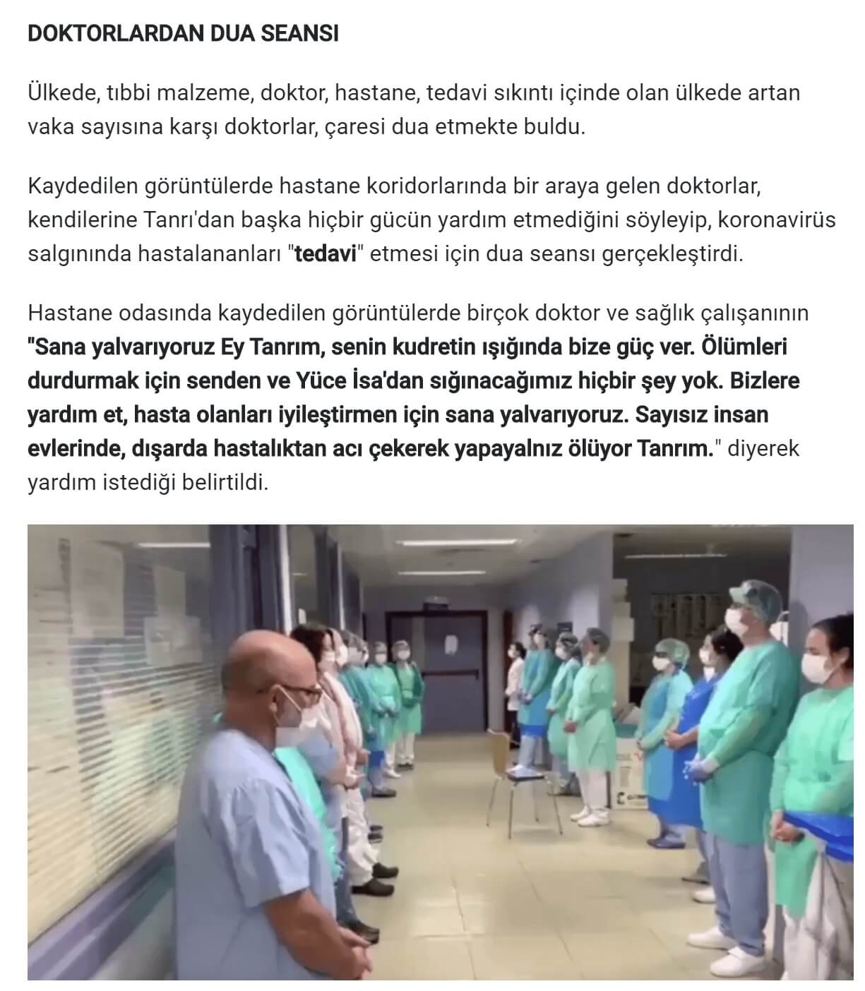 Hastane odasında kaydedilen görüntülerde birçok doktor ve sağlık çalışanının “Sana yalvarıyoruz Ey Tanrım, senin kudretin ışığında bize güç ver. Ölümleri durdurmak için senden ve Yüce İsa’dan sığınacağımız hiçbir şey yok. Bizlere yardım et, hasta olanları iyileştirmen için sana yalvarıyoruz. Sayısız insan evlerinde, dışarda hastalıktan acı çekerek yapayalnız ölüyor Tanrım.” diyerek yardım istediği belirtildi.”