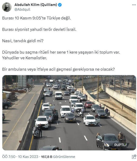 Abdullah Kilim (Quilliam) (@Abdquil): “Burası 10 Kasım 9:05’te Türkiye değil. Burası siyonist yahudi terör devleti İsrail. Nasıl, tanıdık geldi mi? Dünyada bu saçma ritüeli her sene 1 kere yaşayan iki toplum var. Yahudiler ve Kemalistler. Bir ambulans veya itfaiye acil geçmesi gerekiyorsa ne olacak?”
