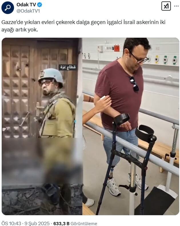 Odak TV (@OdakTV1): “Gazze’de yıkılan evleri çekerek dalga geçen işgalci İsrail askerinin iki ayağı artık yok.”