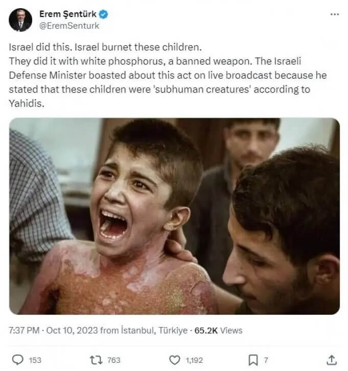 Turhan Bozkurt (@TurhanBozkurTV): “Hamas’a savaş ilan eden İsrail, savaş uçakları ile sivil-asker ayrımı gözetmeksizin Gazze’yi bombalamaya başladı.”