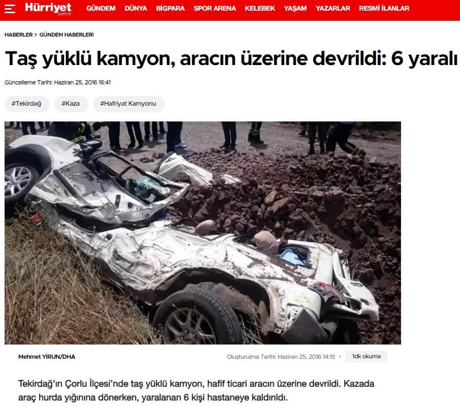 Tekirdağ’ın Çorlu İlçesi’ndeki Önerler Mahallesi’nde taş yüklü kamyonun hafif ticari aracın üzerine devrildiği kazada araç hurda yığınına dönerken yaralanan 6 kişi hastaneye kaldırılmış.