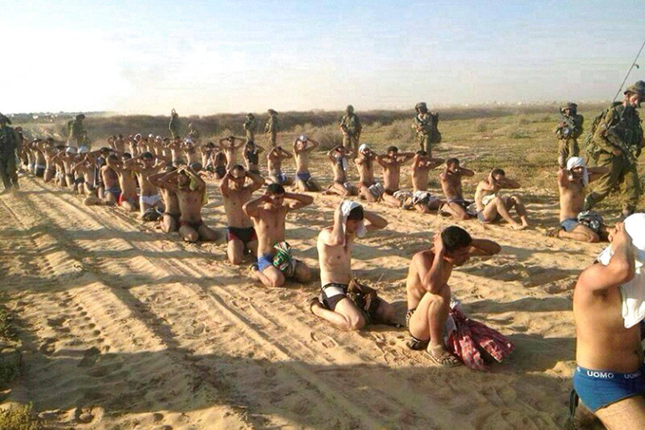İsrail’in gözaltına aldığı Filistinlileri yarı çıplak ve elleri başının üstünde beklettiği görülen fotoğraf 24 Temmuz 2014 günü Gazze Şeridi’nde kaydedilmiş.