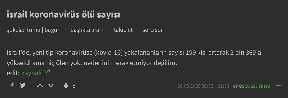 Resmî açıklamalar, basına yansıyan haberler ve yayınlanan istatistiklere rağmen sosyal medyada İsrail’de koronavirüs vakasına rastlanmadığı, İsrail’de koronavirüs salgınında yaşamını yitiren kimsenin olmadığı yönünde iddiaların dile getirildiği görülüyor.