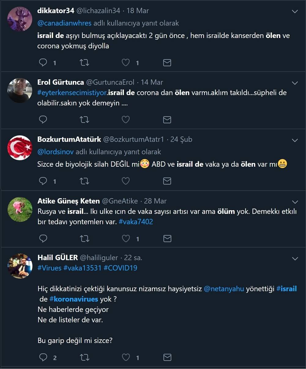 “İsrail’de virüs yok”, “İsrail’de virüsten ölen yok”, “İsrail aşıyı bulmuş”, “dünyada koronavirüsten ölen Yahudi yok” gibi söylemleri içeren paylaşımlardan bazıları şu şekilde: