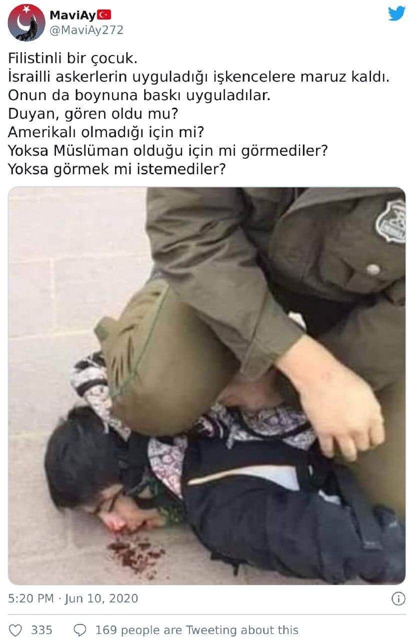 “Filistinli bir çocuk. İsrailli askerlerin uyguladığı işkencelere maruz kaldı. Onun da boynuna baskı uyguladılar. Duyan, gören oldu mu? Amerikalı olmadığı için mi? Yoksa Müslüman olduğu için mi görmediler? Yoksa görmek mi istemediler?”
