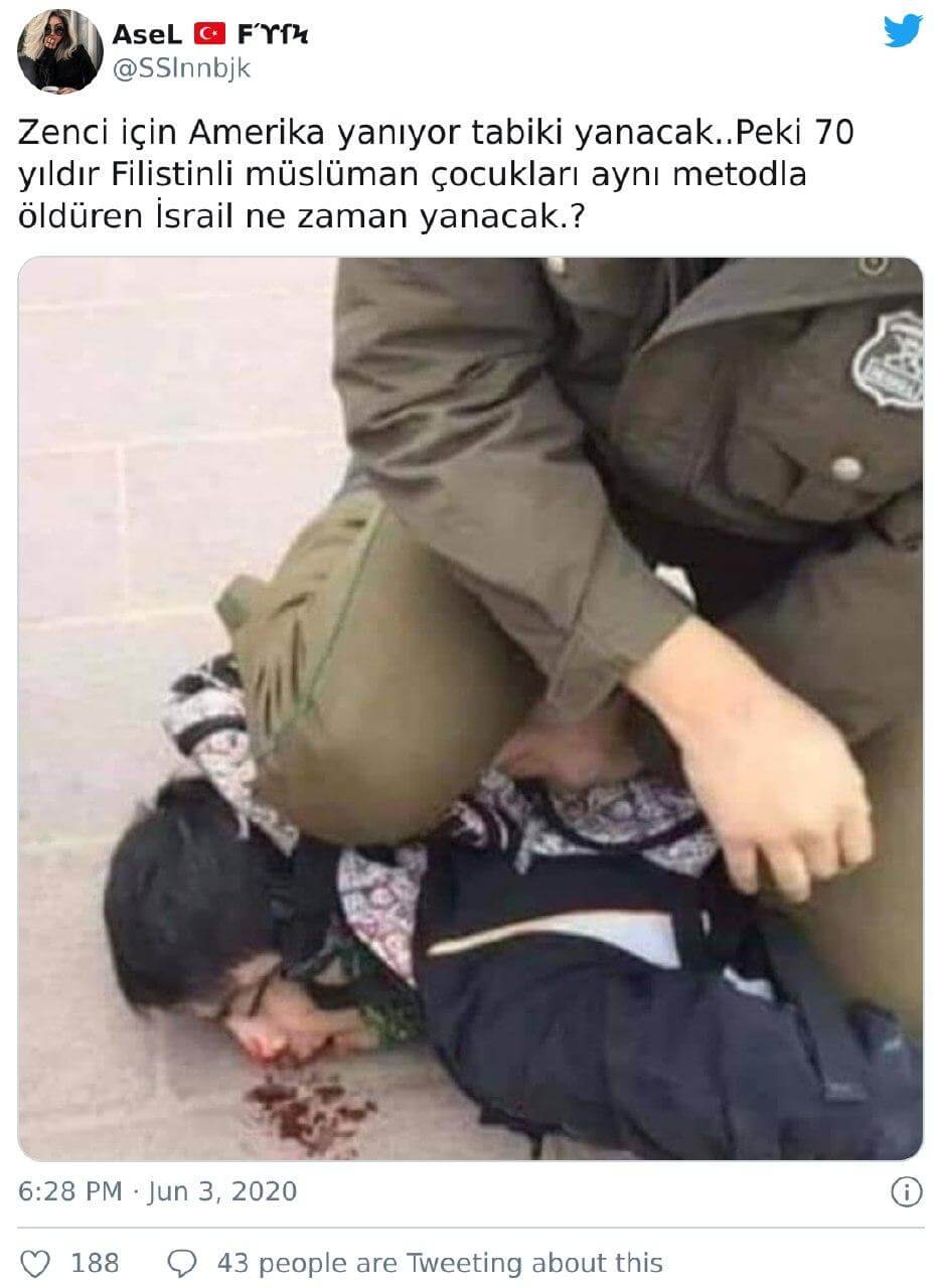 “Zenci için Amerika yanıyor tabiki yanacak..Peki 70 yıldır Filistinli müslüman çocukları aynı metodla öldüren İsrail ne zaman yanacak.?”