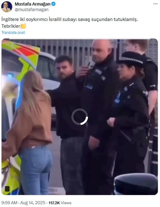 Mustafa Armağan (@mustafarmagan): “İngiltere iki soykırımcı İsrailli subayı savaş suçundan tutuklamiș. Tebrikler”