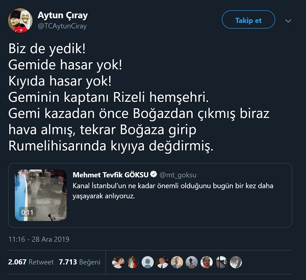 28 Aralık 2019 tarihli paylaşımıyla (Internethaber.com eski yazarı) Aytun Çıray.