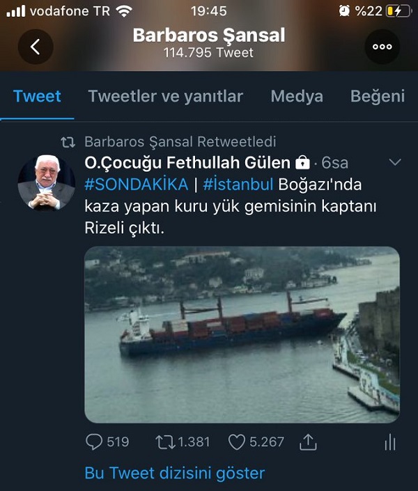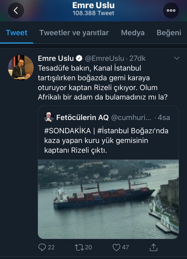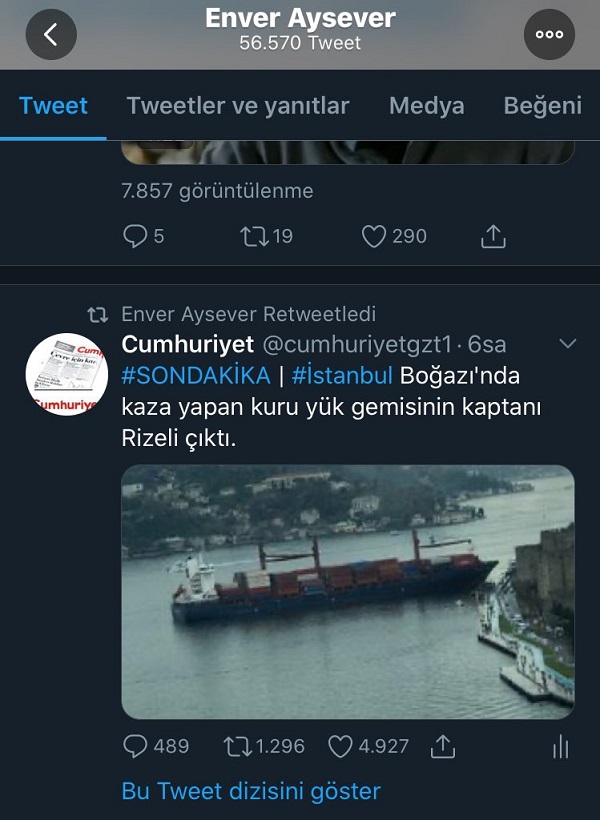 Halbuki, kaza yapan gemi kaptanının Rizeli olduğu iddiası Cumhuriyet Gazetesini taklit eden bir parodi profilin trollemesinin eseriydi.