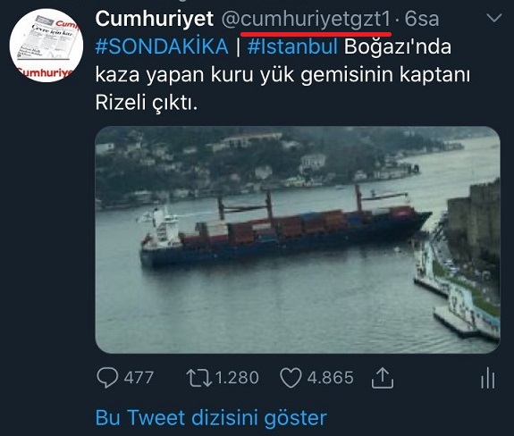 “Cumhuriyetgzt1” uzantılı hesaptan atılan “#SONDAKİKA | #İstanbul Boğazı’nda kaza yapan kuru yük gemisinin kaptanı Rizeli çıktı.” içerikli tweet, Cumhuriyet Gazetesi’nin sosyal medya hesabından atıldı sanılarak kayda değer sayıda sosyal medya kullanıcısı tarafından paylaşılmıştı.