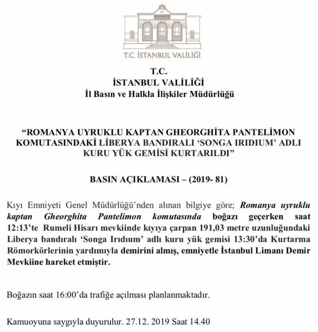 İstanbul Valiliği, Kıyı Emniyeti Genel Müdürlüğü’nden aldığı bilgiyi paylaşarak İstanbul Boğazı’nda Rumeli Hisaı mevkiinde kıyıya çarpan Liberya bandıralı ‘Songa Irıdıum’ adlı kuru yük gemisinin Romanya uyruklu kaptan Gheorghita Pantelimon komutasında olduğunu duyurmuştu.