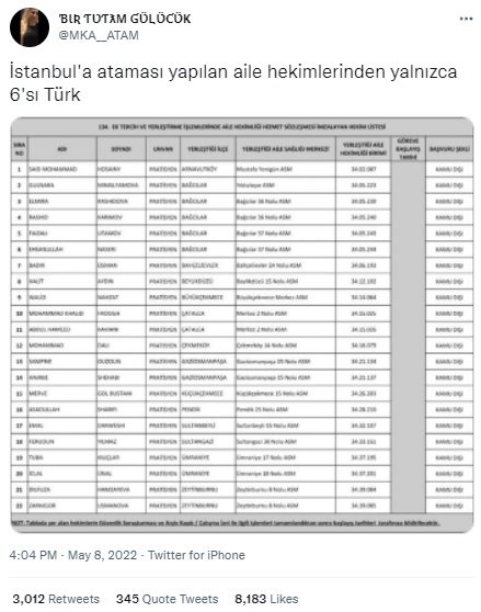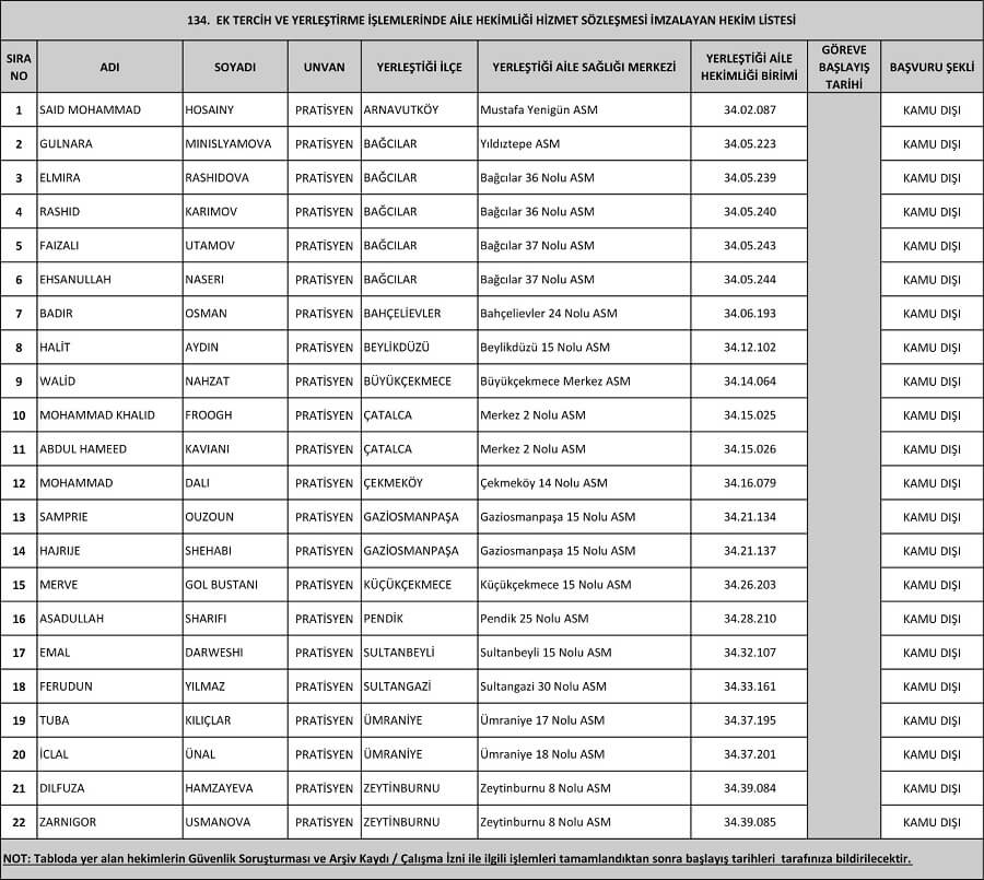 Sağlık Bakanlığı İstanbul Sağlık Müdürlüğü tarafından açıklanan 134. ek tercih ve yerleştirme işlemlerine ait Aile Hekimliği Hizmet sözleşmesi imzalanan 22 doktorun sadece 6’sının Türk olduğu iddiasıyla sunulan ve tepki çeken liste şu şekilde (Ataması yapılan doktorların hangi milletten olduğu yönündeki değerlendirmelerin sadece ad ve soyad üzerinden yapıldığı, işbu yazıdaki atıfların ülkemizde yaygın şekilde kullanılan isim ve soy isimler üzerinden benzer bir yöntem izlendiğini aktarmakta fayda var.):