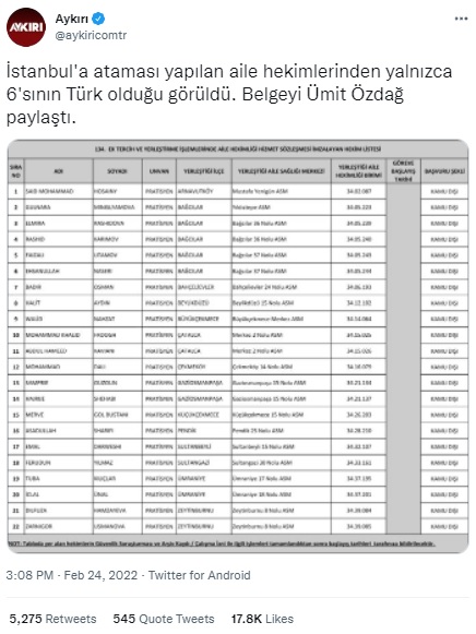 2022 yılı Şubat ayında haber sitelerine ve sosyal medyaya yansıyan İstanbul’a ataması yapılan 22 doktorun sadece 6’sının Türk olduğu iddiası tepki çekmişti.