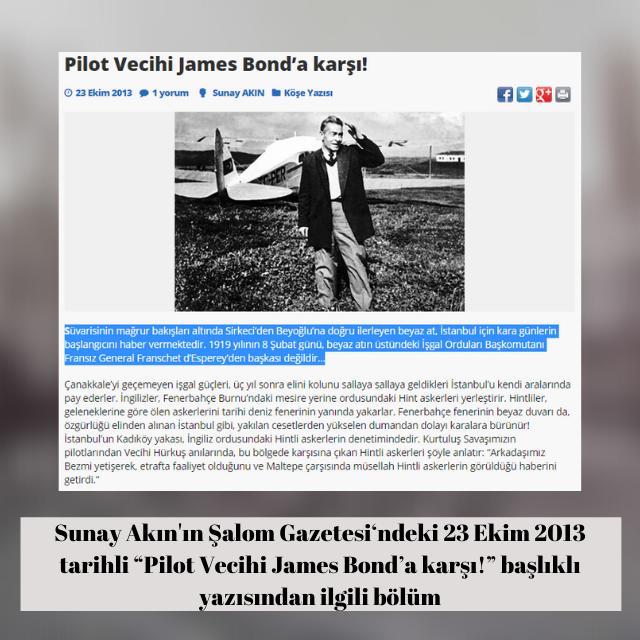 Şalom Gazetesi‘ndeki “Pilot Vecihi James Bond’a karşı!” başlıklı 23 Ekim 2013 tarihli yazısıyla Sunay Akın: