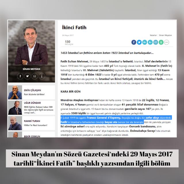 Sinan Meydan’ın Sözcü Gazetesi’ndeki “İkinci Fatih” başlıklı 29 Mayıs 2017 tarihli yazısı