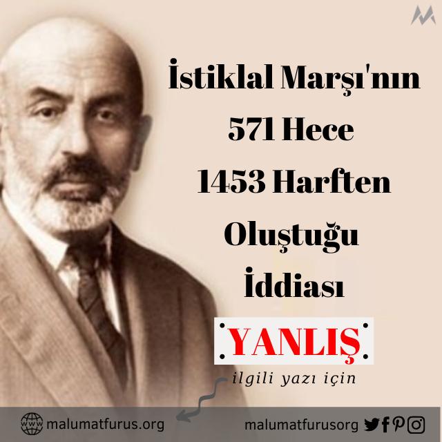 Milli şairimiz Mehmet Akif Ersoy tarafından kaleme alınan ve Türkiye Büyük Millet Meclisi’nin 12 Mart 1921 tarihli oturumunda millî marş olarak kabul edilen İstiklâl Marşı’nın hece sayısının milâdi takvime göre Hz. Muhammed’in doğduğu yıl olan 571, harf sayısının ise İstanbul’un fethedildiği yıl olan 1453 olduğu iddiası doğru değildir. İstiklal Marşı 606 hece 1455 harften oluşmaktadır.