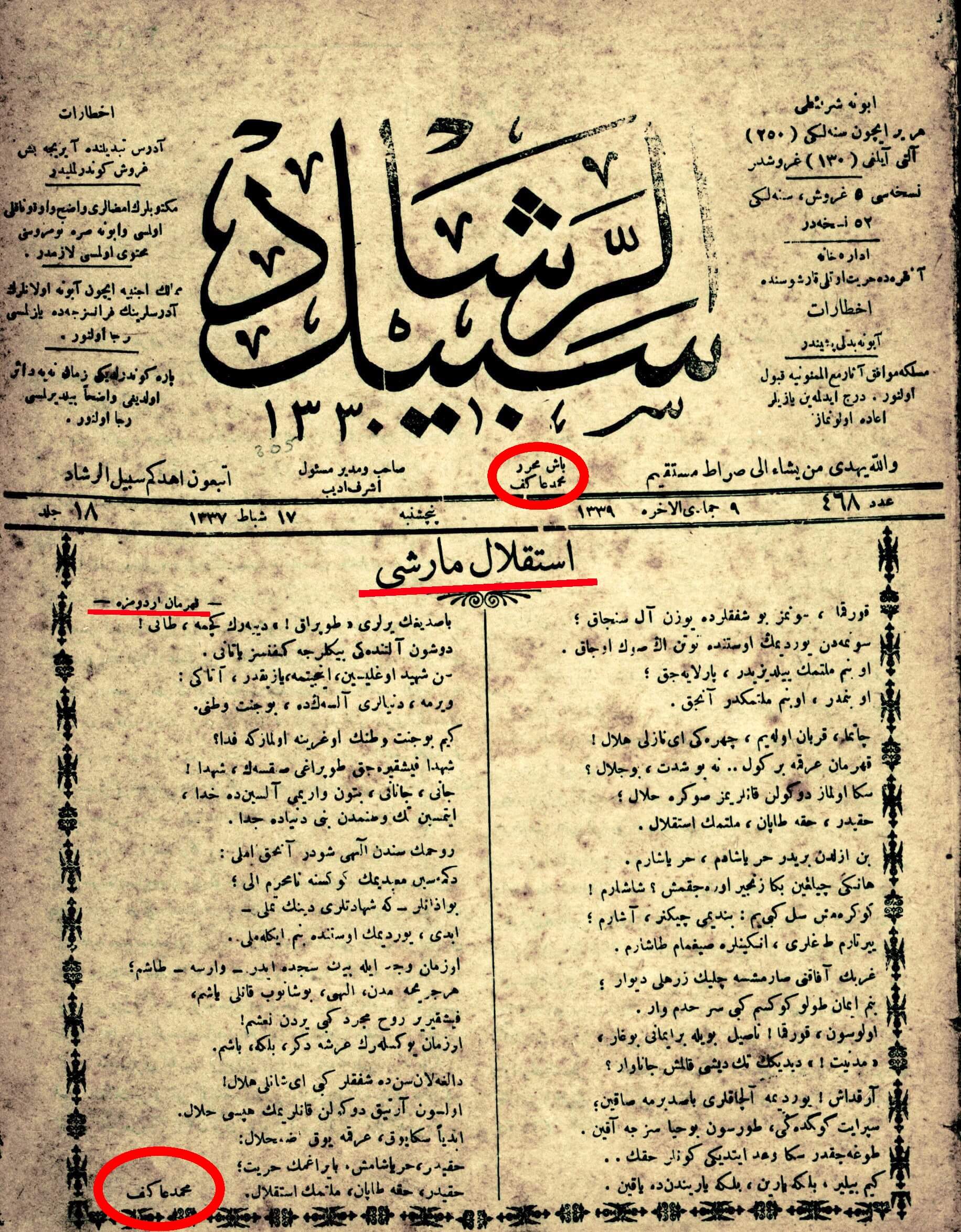 18 Şubat 1921 tarihli Sebilürreşad dergisinde Mehmet Âkif Ersoy imzasıyla yayımlanan İstiklâl Marşı