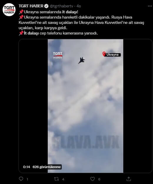Ukrayna Hava Kuvvetlerine ait Mig-29 ile Rus Hava Kuvvetlerine ait Sukhoi Su-30MK’nın havada it dalaşına giriştiği ana ait olduğu sanılarak paylaşılan video “Dijital Savaş Simülatörü” (“Digital Combat Simulator” – DCS) olarak adlandırılan gerçekçi hava savaşı simülasyonundandı (Türkçemize “it dalaşı” olarak çevrilen “dogfight“, iki ülkeye ait savaş uçaklarının birbiri çevresinde burgu gibi dönüşlerle taciz için manevra yapması anlamında kullanılan bir terim).
