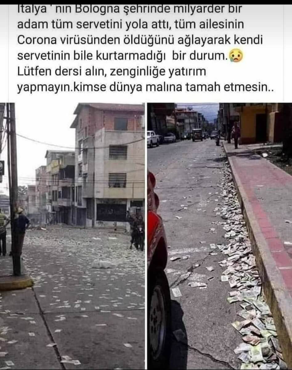“İtalya’ın bologna şehrinde milyarder bir adam tüm servetini yola attı, tüm ailesini corona virüsünden öldüğünü ağlayarak kendi servetinin bile kurtarmadığı bir durum☹️lütfen dersi alın zenginliğe yatırım yapmayın. Kimse dünya malına tamah etmesin..”